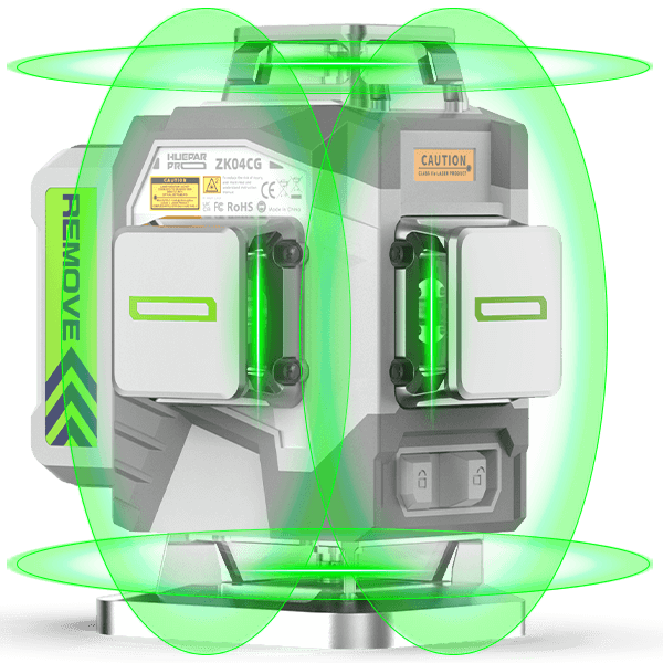 The Huepar ZK04CG is equipped with an 8000mAh rechargeable Li-ion battery, providing up to 8 hours of operation with all 4 x 360° green laser beams active. It features a Type-C charging port, allowing you to charge the battery via a car charger, power bank, or other sources. Battery indicators keep you informed of the power status at all times. Additionally, the removable Li-ion battery includes a micro-USB port, which can be used as a power bank to charge other devices, such as a laser distance meter or other laser levels and tools.