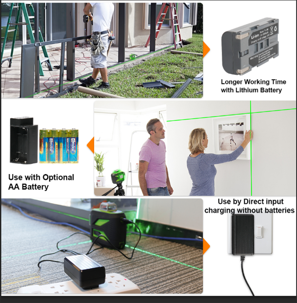 Direct input charging: This laser tool can be used at job site with direct input charging even if take out the battery.