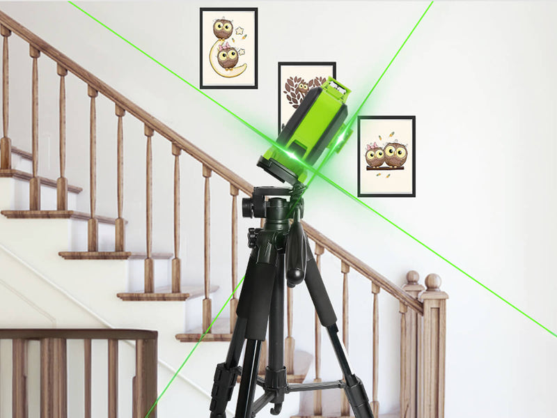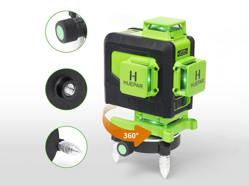 The laser level is equipped with a metal micro-adjust fine-turning pivoting base, and the micro rotary knob allows for 360° adjustment. Users can adjust the height by rotating the three legs of the adapter, even on a tilted surface. The 5/8" threaded mount allows it to be attached to a tripod or other tools for use.