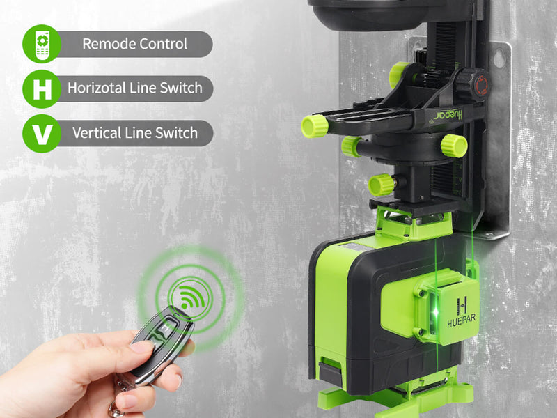 Short press the H and V buttons on the keypad to switch the horizontal and vertical laser lines separately. The remote control allows selection of the 4x360° laser lines individually from up to 33 feet away. In manual mode, when all laser lines are off, the indicators remain on.