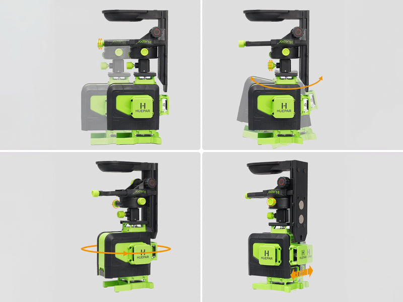 The Huepar Laser Level Fine-tuning Bracket features four fine adjustment knobs, allowing precise adjustments: left and right within 1.2 inches (3cm), front and back within 2.2 inches (5.5cm), height within 3.6 inches (9cm), and 360° horizontal rotation. Graduations are marked in inches and centimeters for easy reading. A dedicated adapter enables the laser tool to be hung closer to the wall for more accurate work.